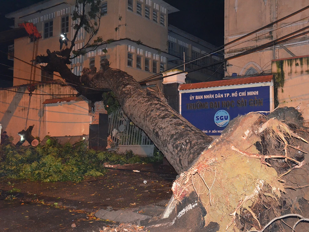 Tối 15-10, cây xà cừ trên đường Tôn Đức Thắng bất ngờ bật gốc đổ xuống đè lên tường và mái tôn nhà để xe trước cổng Trường ĐH Sài Gòn thuộc địa bàn phường Bến Nghé, quận 1, TP.HCM.