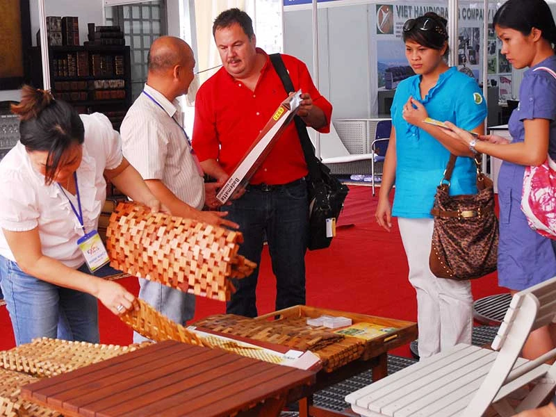 Doanh nhân nước ngoài đặt mua hàng mỹ nghệ tại hội chợ xuất khẩu TP.HCM. Ảnh: HTD