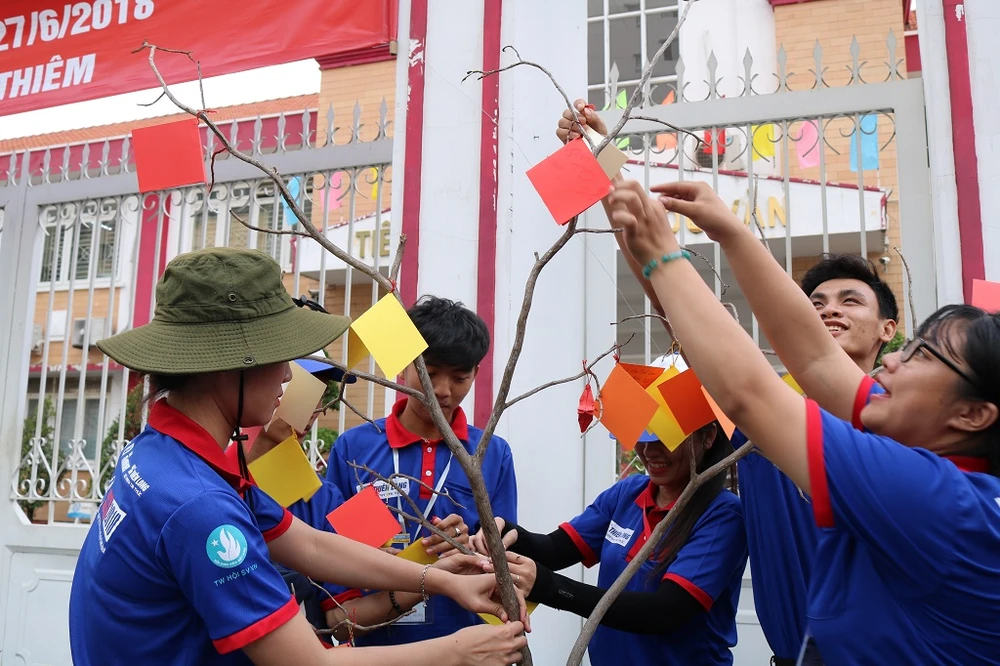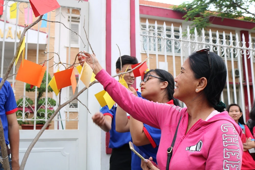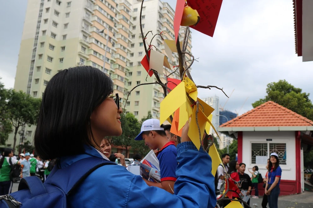 Dù gặp nhiều khó khăn trong triển khai ý tưởng “cây điều ước” nhưng các bạn vẫn kiên trì để mang lại niềm vui ấm áp cho thí sinh và phụ huynh. Ảnh: THỦY TRÚC