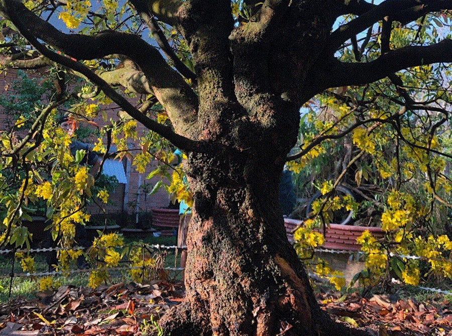 Hơn 20 năm đưa về vườn nhà trồng, cây mai phát triển rất tốt và ngày càng đẹp. Theo anh Dũng, đây là cây mai xù nu đẹp, sần sùi, hoa đều 5 cánh không lai tạo, rất thơm và đặc biệt hoa mọc khắp nơi từ thân, cành thậm chí dưới rễ cũng có hoa.