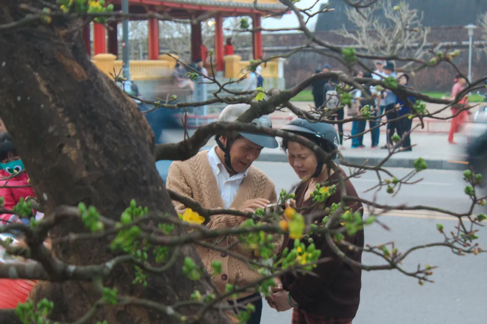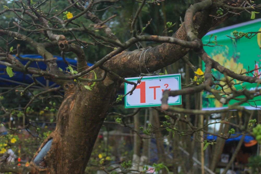 Cây mai được treo giá 1 tỉ tại hội chợ hoa xuân cố đô Huế. Góc cây to, có đường kính hơn 30 cm. Ảnh: NGUYỄN DO