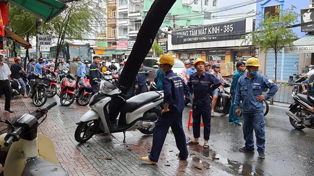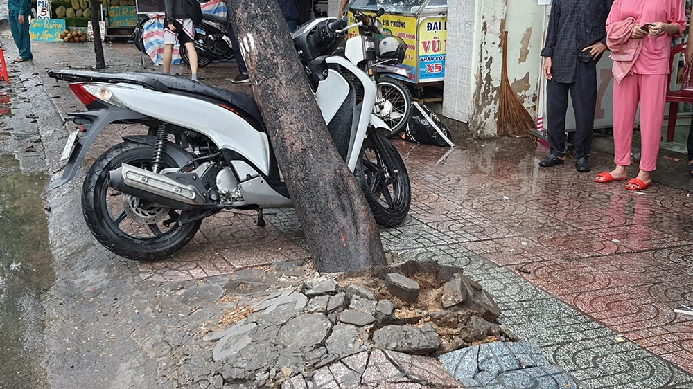 Chiều 31-8, trong cơn mưa lớn, cây me trước nhà số 326 đường Tùng Thiện Vương bị bật gốc, đổ nghiêng về một bên.