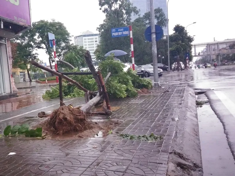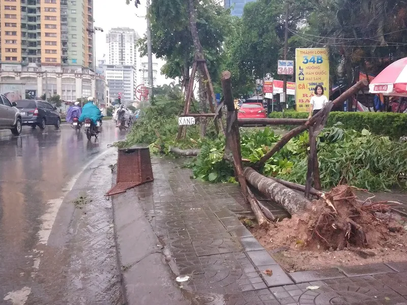 Một số tuyến đường, do số lượng cây bị đổ quá nhiều, lực lượng chức năng phải tiến hành căng dây để các phương tiện giao thông không lưu thông qua. Trận gió lớn và kéo dài khiến không chỉ các cây nhỏ và nhiều cây cổ thụ của Hà Nội cũng bị bật gốc, gục đổ.