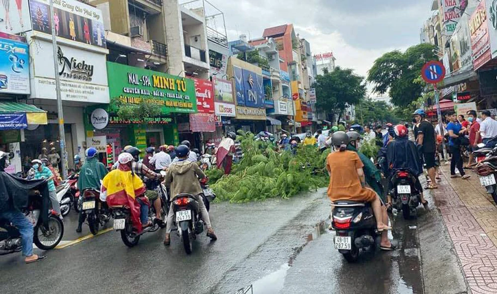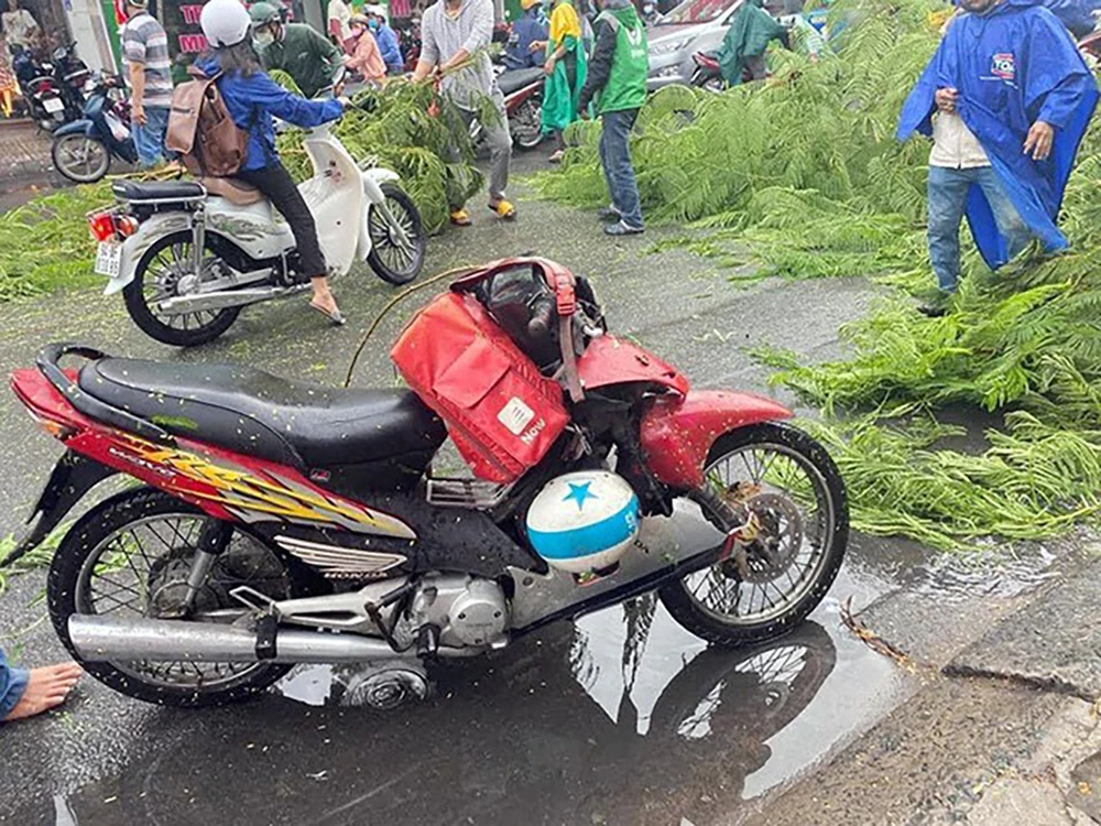 Nhiều người đi xe máy tá hỏa, họ la hét cảnh báo những người gần hiện trường. Một người đàn ông chừng 50 tuổi chạy xe máy đi giao hàng, bị ngọn cây đè trúng, ngã xuống đường.