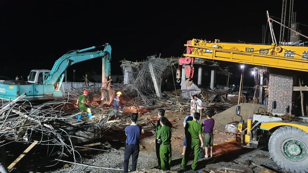 Theo ghi nhận, tại hiện trường một phần công trình cây xăng phía đổ bê tông đã bị đổ sập, chỉ còn một phần mới ghép thép và cốp pha không bị đổ. Cơ quan chức năng điều một số xe cứu hỏa, hai máy xúc, một máy cẩu tới hiện trường bốc xúc đống bê tông, sắt thép, giàn giáo đổ nát để tìm kiếm nạn nhân nghi bị vùi lấp. Tới 23 giờ 45 phút lực lượng chức năng vẫn chưa tìm thấy nạn nhân còn lại nghi bị vùi lấp.