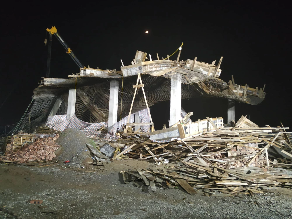 Tuy nhiên, khi một số xe bồn phun bê tông lên một phần mái, bất ngờ mái cây xăng đổ sập xuống làm ít nhất bảy người bị thương. Một công nhân khác đang mất tích nghi bị vùi lấp trong đống đổ nát.