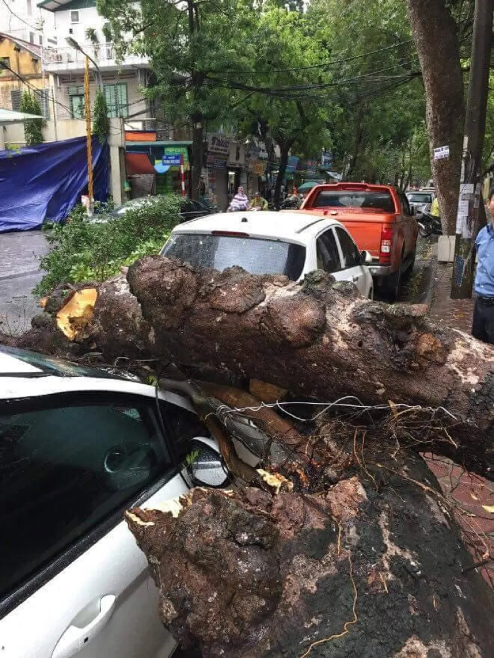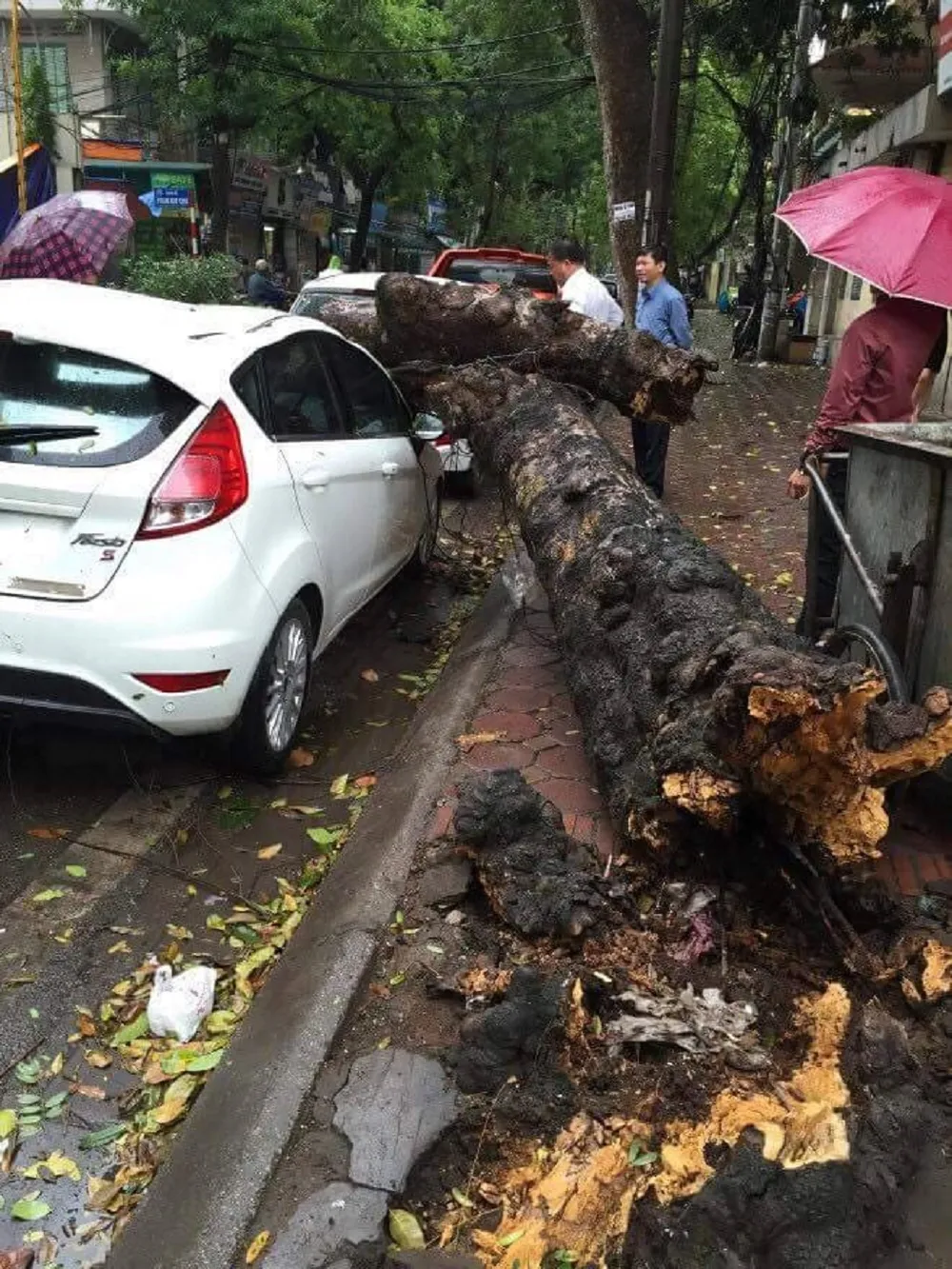 Sự việc xảy ra khoảng 8 giờ sáng 31-3, trên đường Phan Huy Chú (quận Hoàn Kiếm, Hà Nội). Thời điểm trên, thời tiết ở Hà Nội đang mưa to kèm theo với gió giật mạnh nên khiến một cây xanh đổ xuống lòng đường và đè vào mui của một xe ô tô đang đỗ khiến xe bị hư hỏng nặng, một xe khác bị trầy xước.