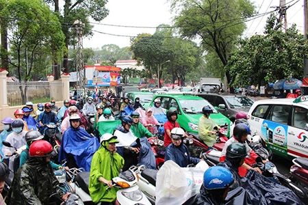 Sự việc trên khiến giao thông ở đoạn đường này ùn tắc khoảng một giờ liền. ẢNH: HÀ PHƯỢNG.