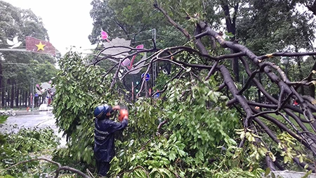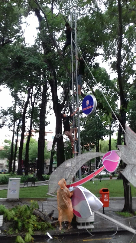 Đến gần 16 giờ sau khi mưa tạnh, gió ngớt công nhân của Công ty Công viên Cây xanh mới tiếp cận được hiện trường để giải tỏa các nhánh cây gãy.