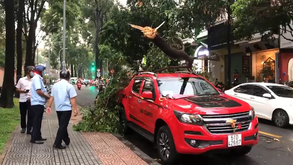 Chừng 17 giờ chiều ngày 15-4, trong mưa to gió lớn, một nhánh cây sao trên đường Chu Mạnh Trinh (phường Bến Nghé, quận 1, TP.HCM) bất ngờ bị gãy, rớt xuống đường.