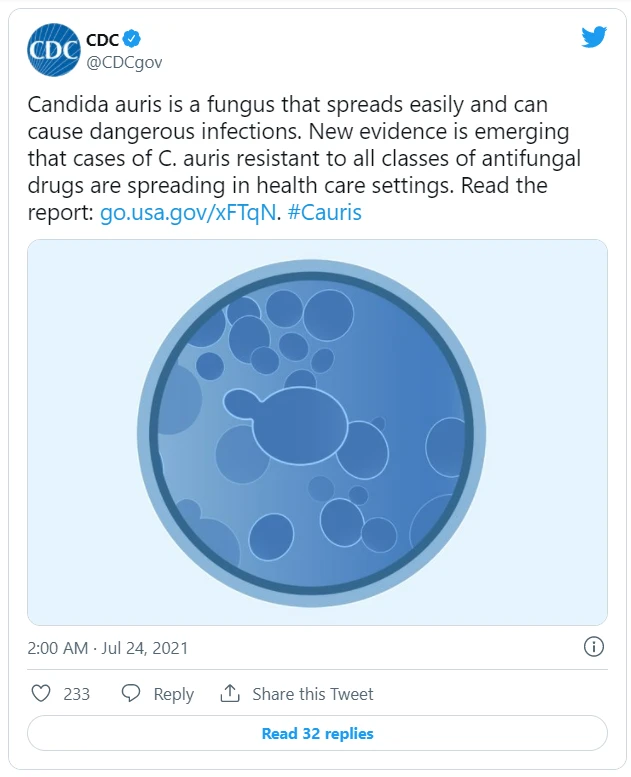 Theo CDC, nấm Candida auris “là một mối đe dọa toàn cầu nghiêm trọng” và chủ yếu lây lan tại địa phương thông qua các cơ sở chăm sóc sức khỏe và có thể chống lại mọi loại thuốc chống nấm.