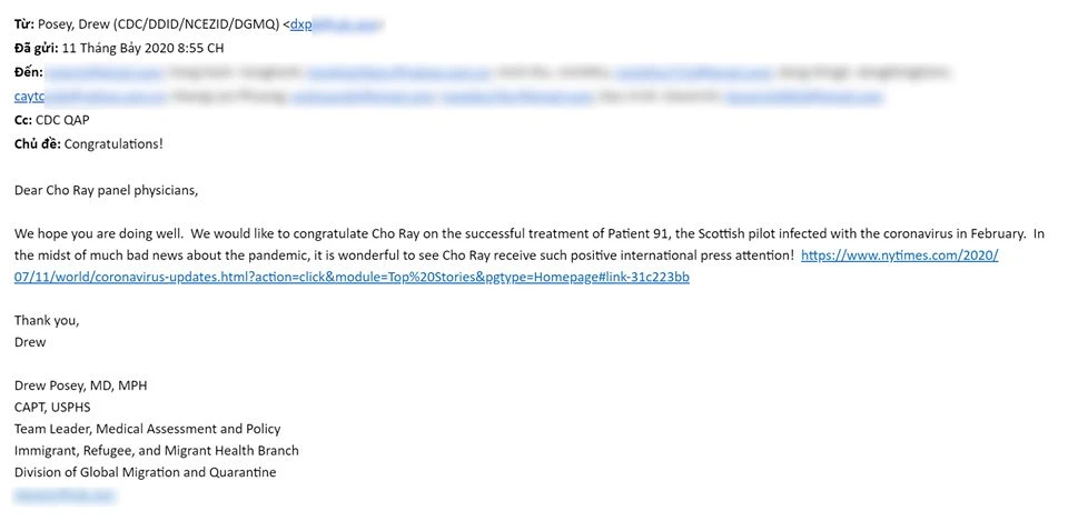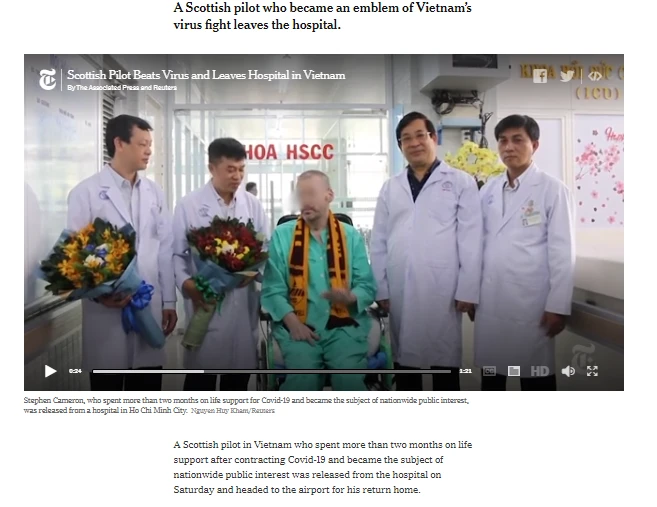 Đại diện CDC Mỹ cũng gửi kèm đường dẫn của bài viết đăng trên tờ New York Times (Mỹ) trong ngày bệnh nhân 91 rời Bệnh viện Chợ Rẫy. Bài viết có tựa đề: A Scottish pilot who became an emblem of Vietnam’s virus fight leaves the hospital (tạm dịch là: Một phi công người Scotland trở thành biểu tượng của cuộc chiến chống virus của Việt Nam được xuất viện).