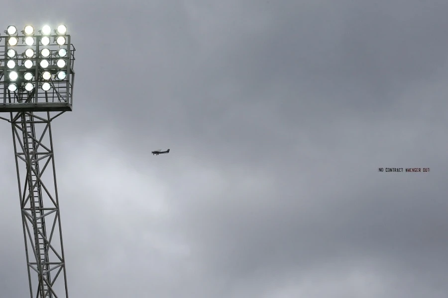 Trước trận Arsenal gặp West Bromwich, một chiếc máy bay cánh quạt do fan Arsenal thuê đã giăng băng rôn lớn với dòng chữ “Không hợp đồng gì nữa! Wenger hãy đi khỏi”. Chiếc máy bay lượn qua lại trên sân vận động ngay trước thời điểm bóng lăn.