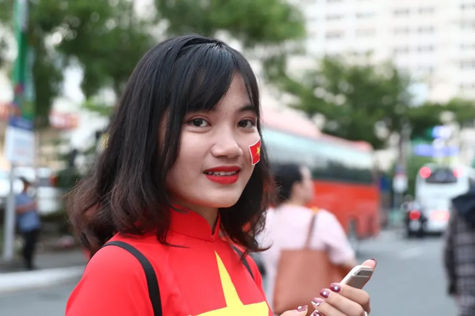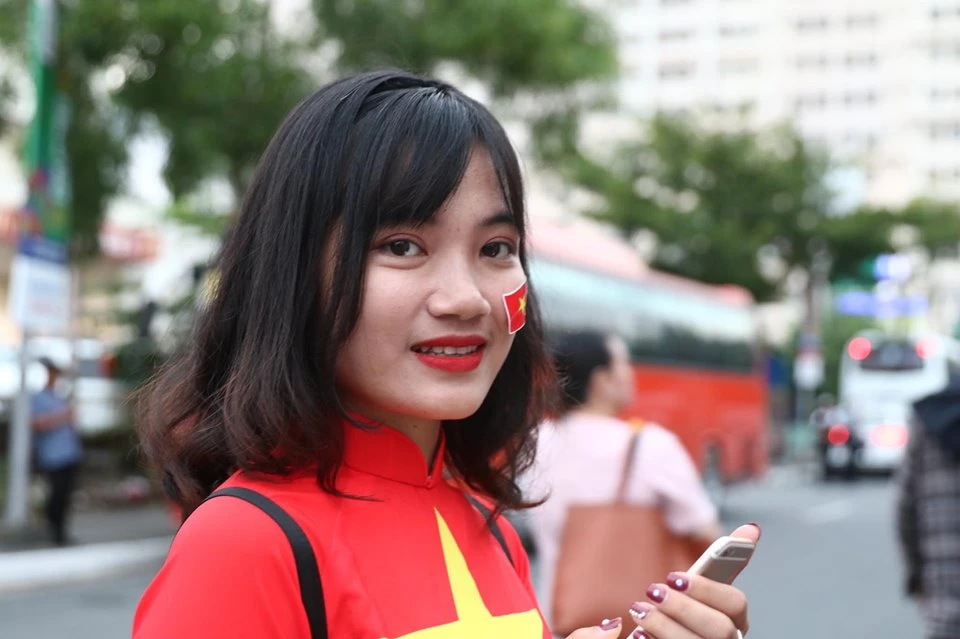 Những CĐV xinh đẹp với chiếc áo cờ đỏ sao vàng ủng hộ U-22 Việt Nam.