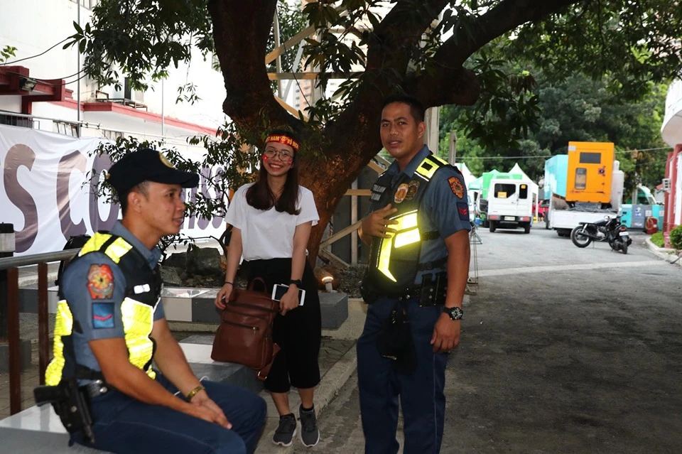 Một CĐV Việt Nam tươi cười bên cạnh lực lượng bảo vệ sân Rizal Memorial.