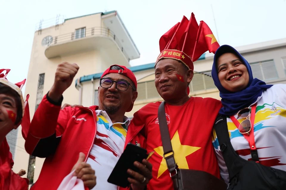 CĐV Việt Nam và Indonesia rất hòa nhã, họ cùng chụp ảnh với nhau.