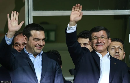 Thủ tướng Thổ Nhĩ Kỳ Ahmet Davutoglu và người đồng cấp Alexis Tsipras bên phía Hy Lạp sự khán trận đấu