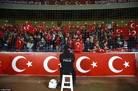 Nhân viên an ninh luôn theo dõi sát sao mọi hành động của các CĐV vốn nổi tiếng quá khích của Thổ Nhĩ Kỳ để tránh sự cố đáng tiếc