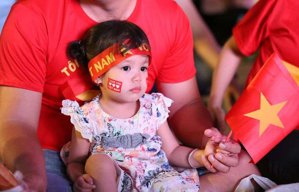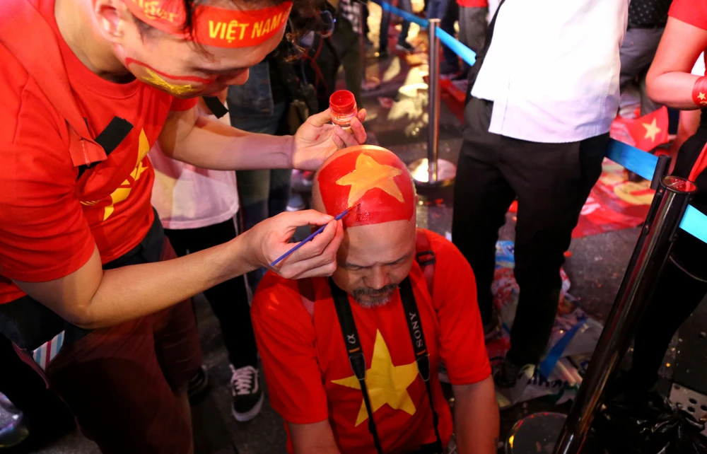 Một cổ động viên vẽ cờ đỏ sao vàng lên đầu cổ vũ đội tuyển.