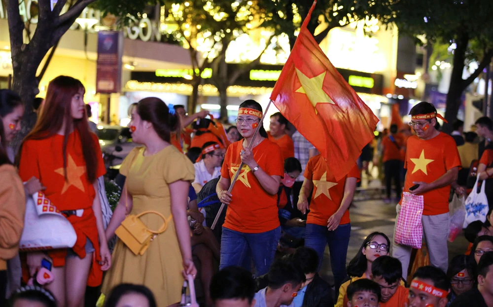 Cờ đỏ sao vàng, cúp vô địch... cùng tiếng hò reo không ngừng trên phố đi bộ.