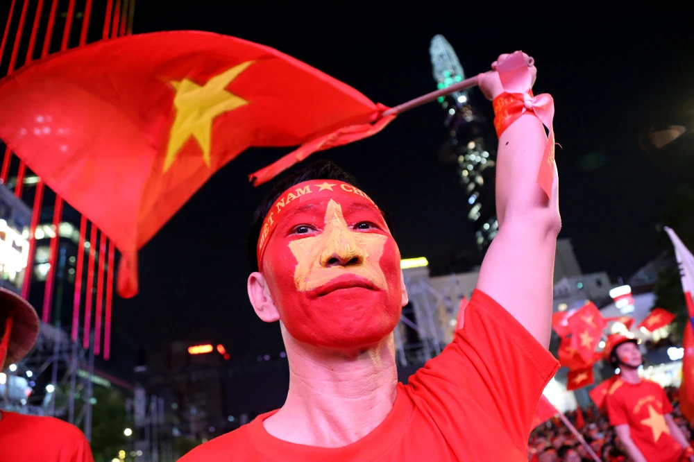 Người hâm mộ mang cờ đỏ sao vàng xuống phố sau giờ làm để cổ vũ đội tuyển.