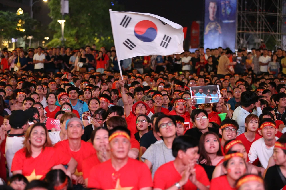 Quốc kỳ của Hàn Quốc được cổ động viên mang đến phố đi bộ cổ vũ đội tuyển và HLV Park Hang-seo.