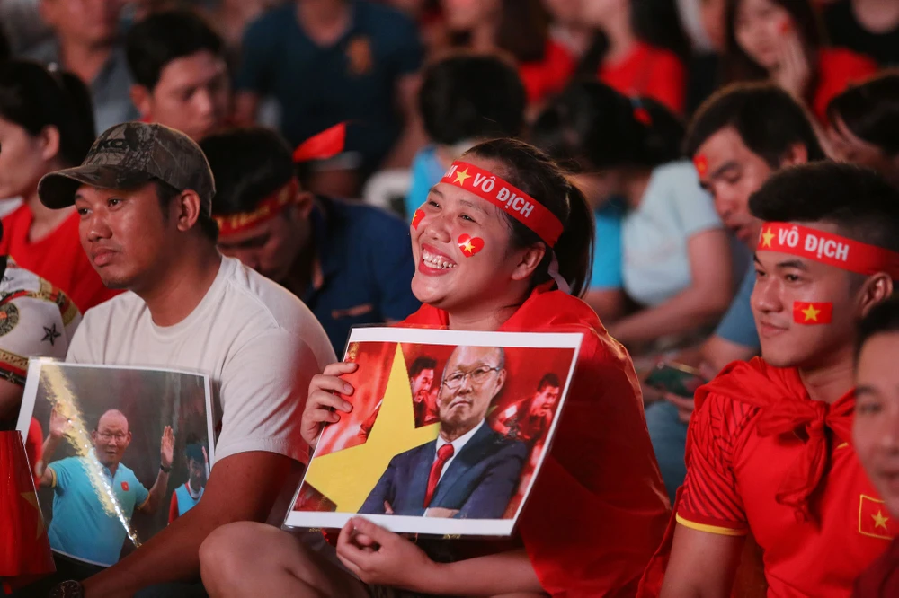 Các cổ động viên mang ảnh của HLV Park Hang-seo đến phố đi bộ cổ vũ đội tuyển.
