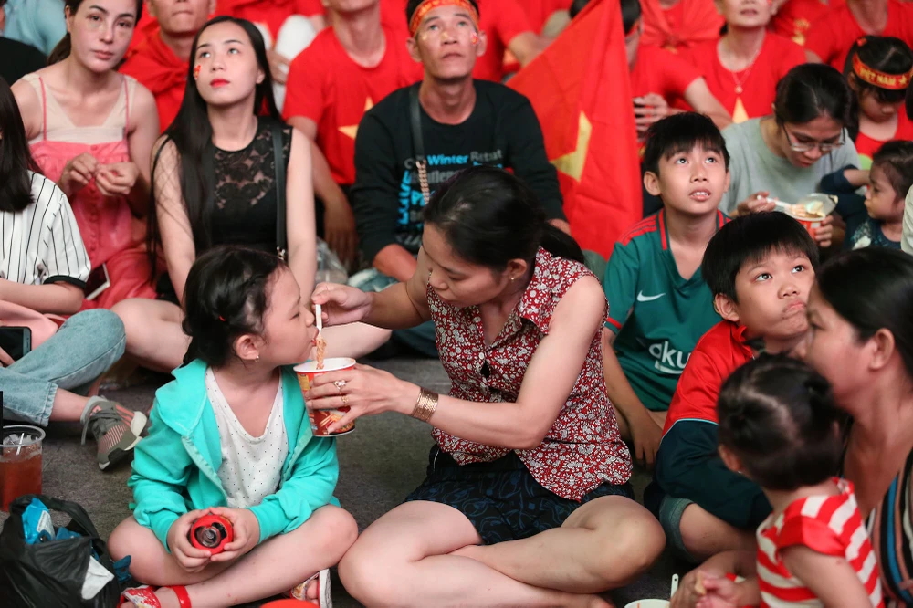 Nhiều phụ huynh đưa con đến phố đi bộ xem bóng và ăn tạm mì gói.