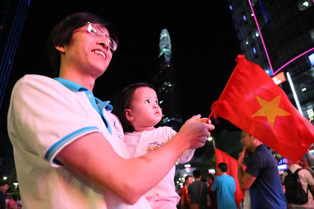 Ông bố bế con ăn mừng chiến thắng của đội tuyển.