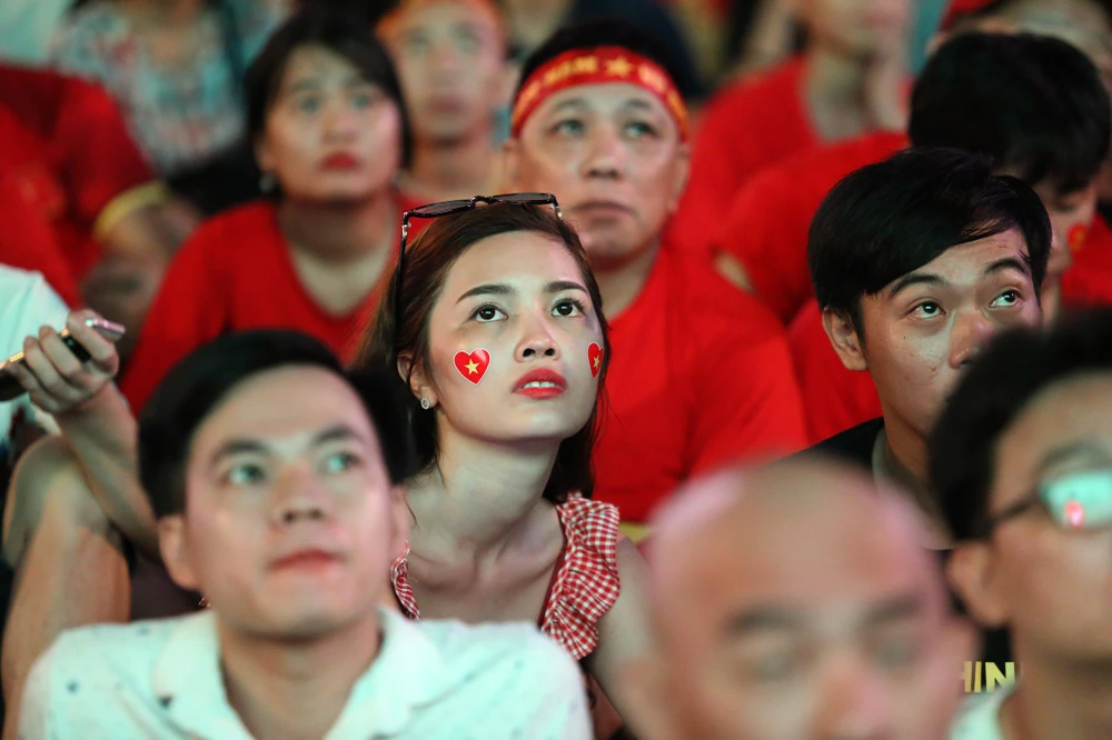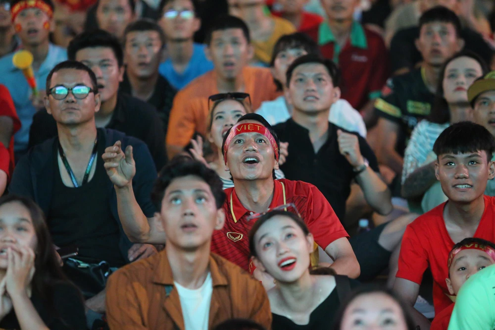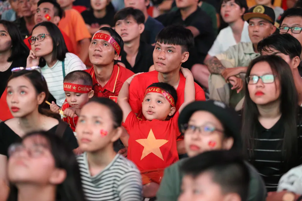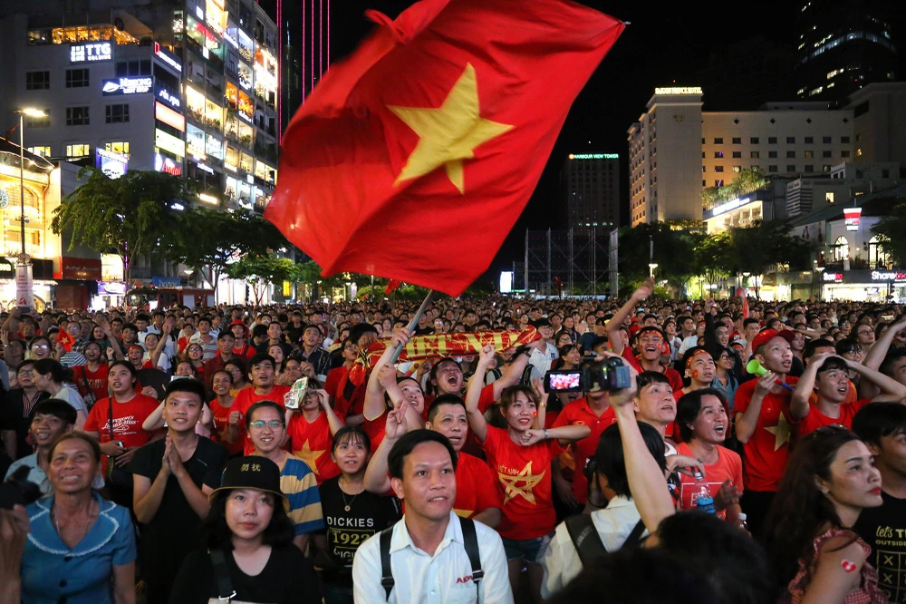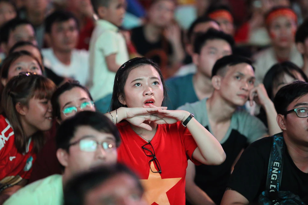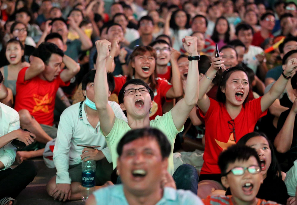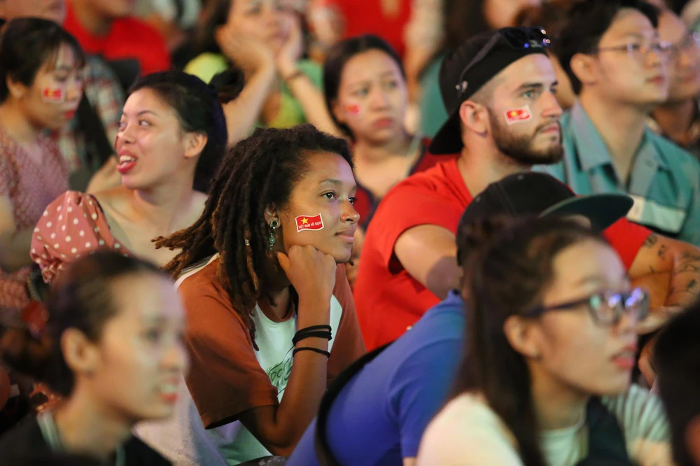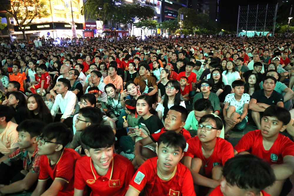 Phố đi bộ Nguyễn Huệ chật kín cổ động viên đến xem và tiếp lửa cho đội tuyển thi đấu.