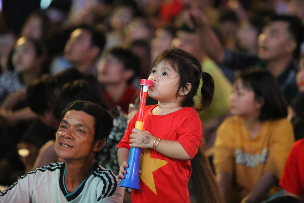 Một cổ động viên nhí mang theo cờ đỏ sao vàng cổ vũ tuyển Việt Nam.