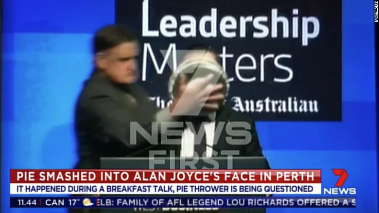 Theo CNN, Alan Joyce là diễn giả chính trong một hội nghị tại khách sạn Hyatt Regency ở TP Perth Úc và sáng 9-5 (giờ địa phương). Khi ông Joyce vừa mới bắt đầu bài phát biểu thì có một người đàn ông mặc đồ vest bước tới phía sau và úp bánh kem vào mặt ông.