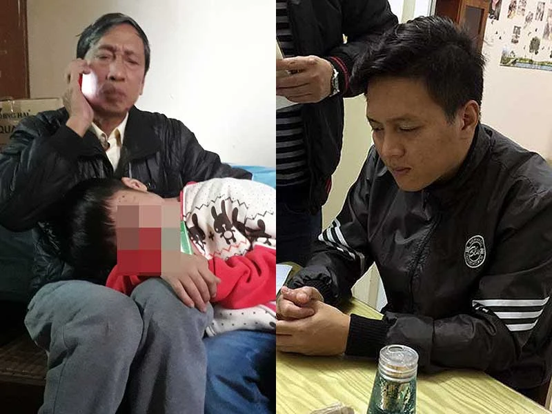 Bé K. (trái) sợ hãi, nép mình vào lòng người thân và Trần Hoài Nam tại cơ quan công an.