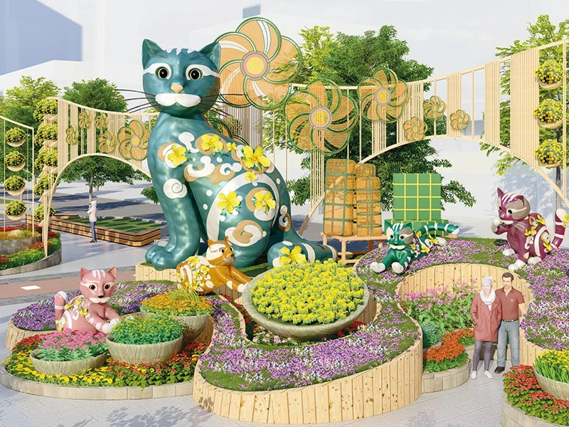 Về thiết kế linh vật cho đường hoa Nguyễn Huệ năm nay, ông Tòng bật mí: Những linh vật ở đường hoa năm nay sẽ có một chú mèo lớn và năm chú mèo nhỏ. Sáu chú mèo này được thể hiện với từng màu sắc khác nhau. Mỗi sắc màu đều tượng trưng cho sự vui tươi mang đầy sắc xuân đến với người chiêm ngưỡng. Hơn thế, những hoa văn trên những chú mèo sẽ là điểm nhấn ấn tượng của năm.