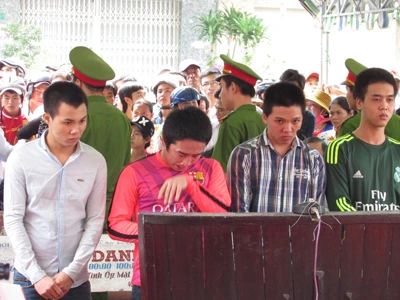 Khi nghe VKS đề nghị tòa phạt tử hình, bị cáo Rạng (thứ hai từ trái qua) đã khóc liên tục. Ảnh: N.NAM