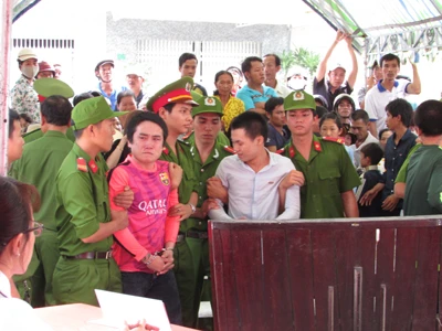 Hai bị cáo Rạng và Giàu sau khi nghe tòa tuyên phạt tử hình đều không giữ được bình tĩnh, phải có hai cảnh sát xốc nách hai bên... Ảnh: N.NAM