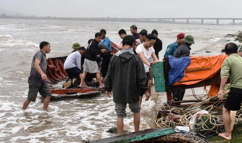 Trục vớt, đưa thuyền của cha con ông Trần Văn Lý lên bờ. Ảnh: Hương Thành