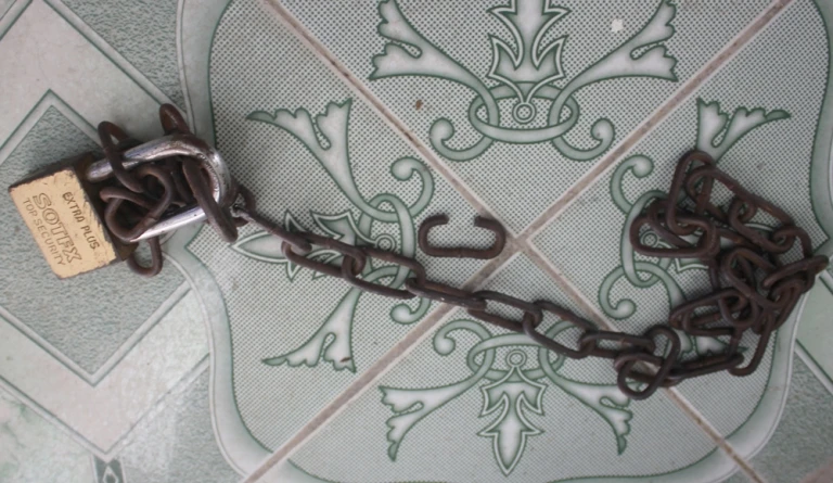 Chiếc xích và ổ khóa tháo từ cổ bé Phan Văn Sỹ. Ảnh: Đắc Lam.