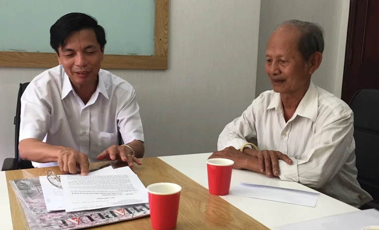 Luật sư Phạm Công Hùng (trái) nhận đơn yêu cầu luật sư của cha bị cáo Minh.