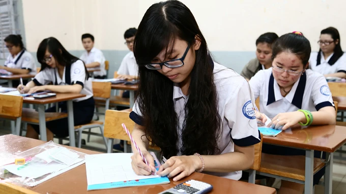 Thí sinh làm thủ tục trước giờ mở đề thi môn địa lý tại hội đồng thi Trường THPT Lê Hồng Phong, TP.HCM chiều 3-6 - Ảnh: N.Hùng