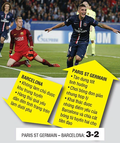 PSG vắng nhiều trụ cột chấn thương như trung vệ Thiago Silva, vua phá lưới Ibrahimovic và tiền đạo cánh Lavezzi... nhưng lại có sự xuất thần của bộ đôi Nam Mỹ Cavani (Uruguay) - Pastore (Argentina). Luiz mở tỉ số ở phút thứ 10 giúp PSG dẫn điểm nhưng hai phút sau Messi đã gỡ hòa 1-1. PSG không chịu thua khi Verratti đánh đầu dẫn 2-1 từ quả phạt góc trước khi Matuidi nâng lên 3-1 ở đầu hiệp 2. Mãi về sau Neymar gỡ bàn 2-3 an ủi cho Barcelona nhưng bấy nhiêu không cứu được một Barcelona để mất đi thế mạnh của mình.