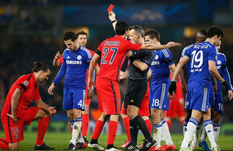 Ảnh 1. Điểm nhấn là tình huống Ibrahimovic nhận thẻ đỏ. Đến lúc này ai cũng nghĩ Chelsea sẽ “làm gỏi” PSG.