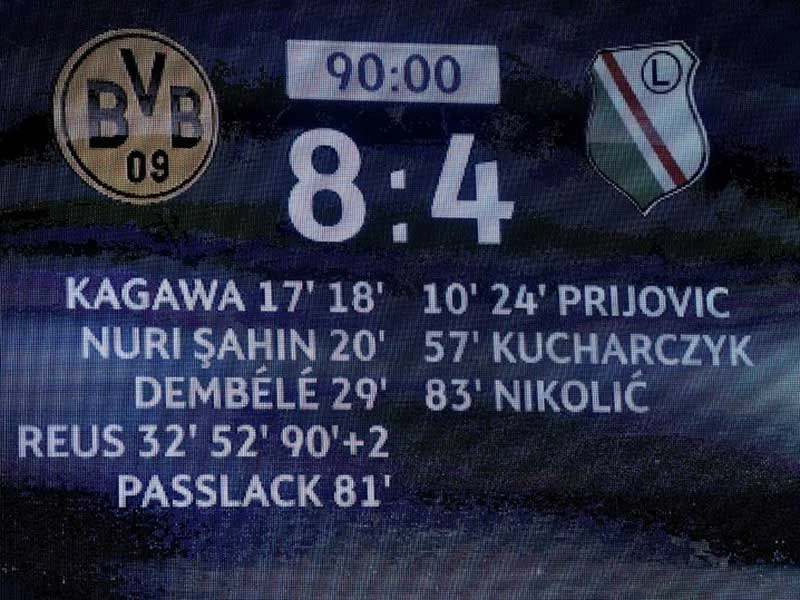 Tỉ số kỷ lục trong trận Dortmund - Legia Warsaw 8-4 với tổng cộng 12 bàn thắng. Ảnh: GETTY IMAGES
