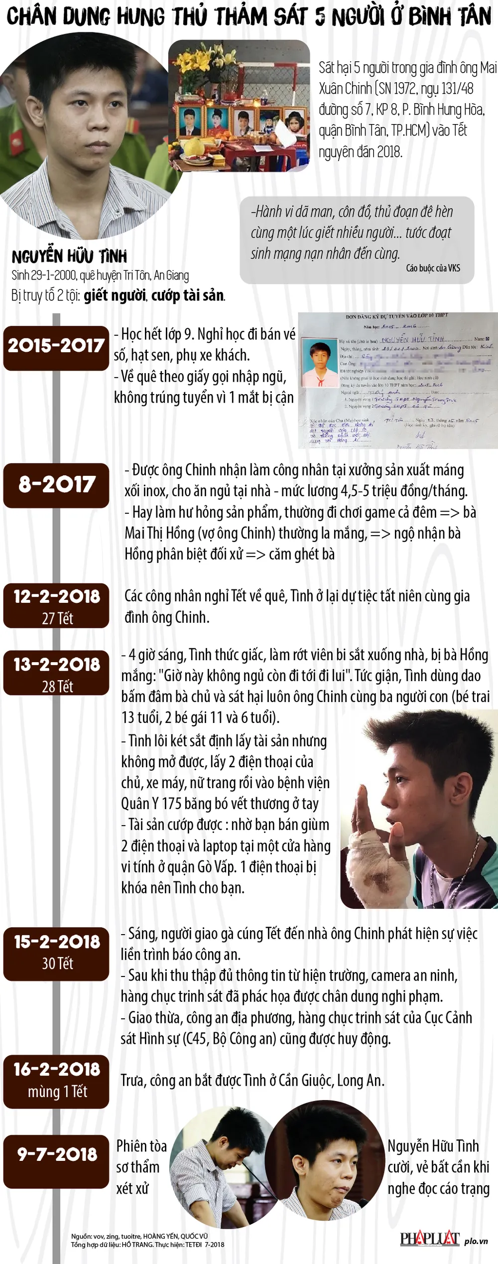 (PLO)- Ngày 9-7, Nguyễn Hữu Tình - kẻ sát hại năm người trong gia đình ông Mai Xuân Chinh gây chấn động dư luận hồi Tết nguyên đán 2018 được áp giải đến TAND TP.HCM. Xin mời bạn đọc cùng nhìn lại chân dung bị cáo này.