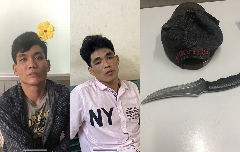 Tâm (bên trái), Minh và con dao gây án. Ảnh CA