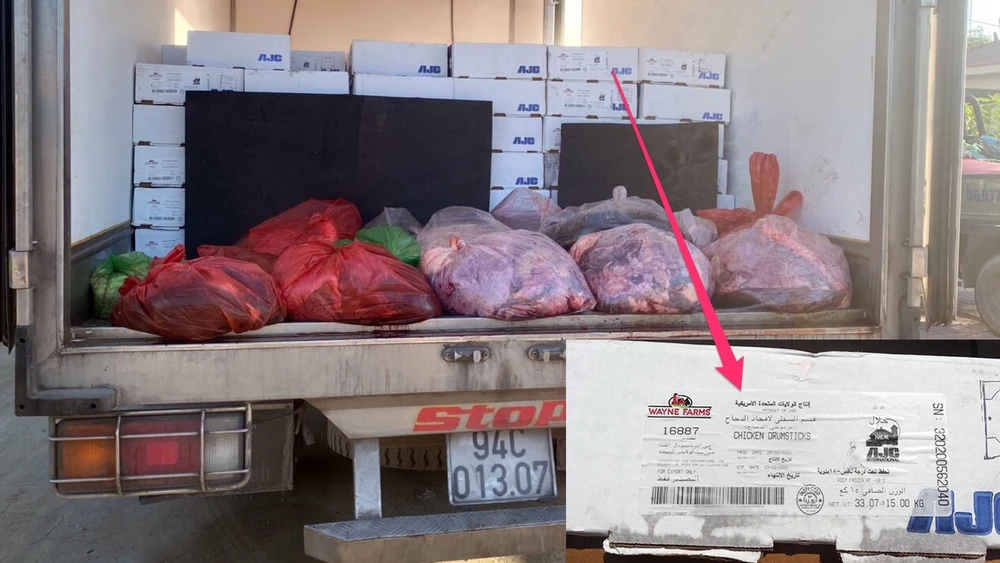 Qua kiểm tra phương tiện, lực lượng chức năng phát hiện khoảng 3,5 tấn sản phẩm động vật, gồm: 200 thùng xương chân heo (mỗi thùng khoảng 10kg), 70 thùng đùi gà tỏi (mỗi thùng khoảng 15kg) có nhãn bằng tiếng nước ngoài và 380kg nội tạng bò được chứa trong các túi nilon.