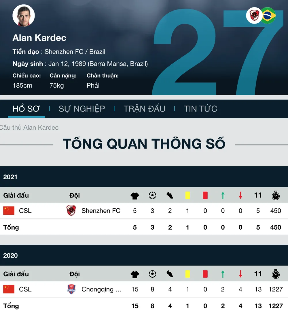 Thống kê chuyên môn của Kardec trong hai mùa giải gần đây.
