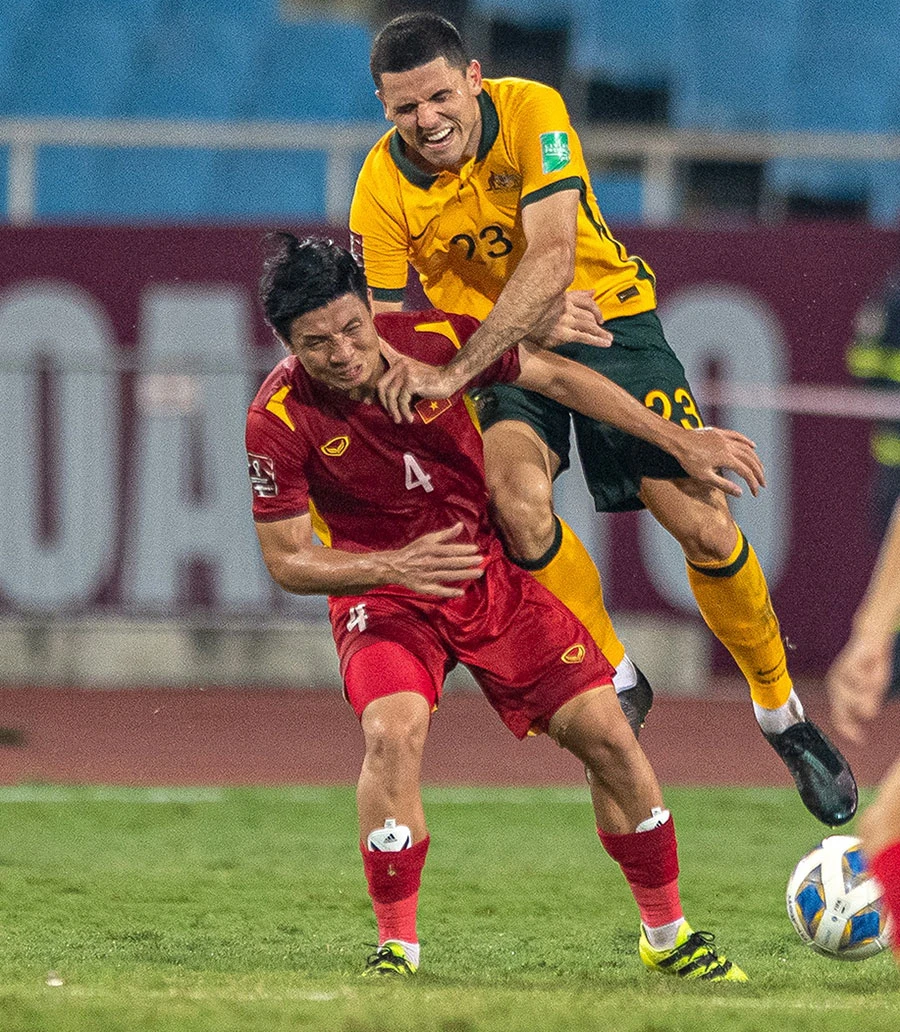 Bùi Tiến Dũng gắng gượng trở lại dù còn chấn thương và phải thay ra giữa hiệp 2 trận thua Úc. Ảnh: HẢI THỊNH