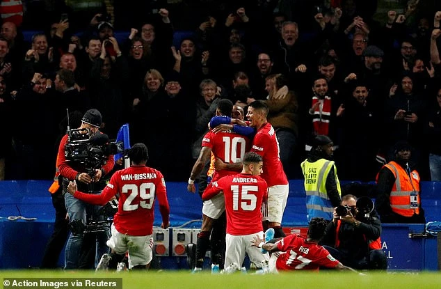 Các cầu thủ Man Utd ăn mừng sau khi Rashford ghi tuyệt phẩm nâng tỉ số lên 2-1 vào lưới Chelsea.