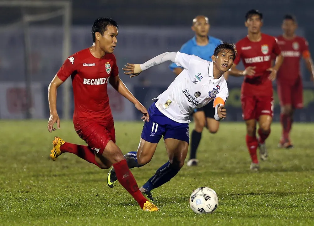 ...Và Chan Vathanaka (11) trong trận Boeungket Angor đánh bại B. Bình Dương loạt trận khai mạc BTV Cup 2016 chiều 2-12. Ảnh: QL